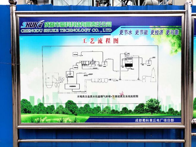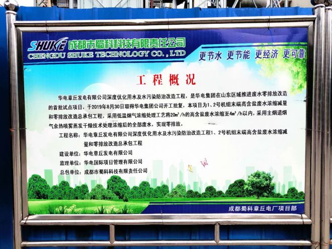 章丘項目是華電山東分公司實施的第二個全廠廢水零排放項目,也是目前國內第二個采用低溫煙氣濃縮工藝+主煙道(余熱)蒸發(fā)工藝路線的電廠。該項目的全廠高鹽廢水零排放的整體工藝實施從設計、施工、安裝、調試全部由蜀科公司完成。